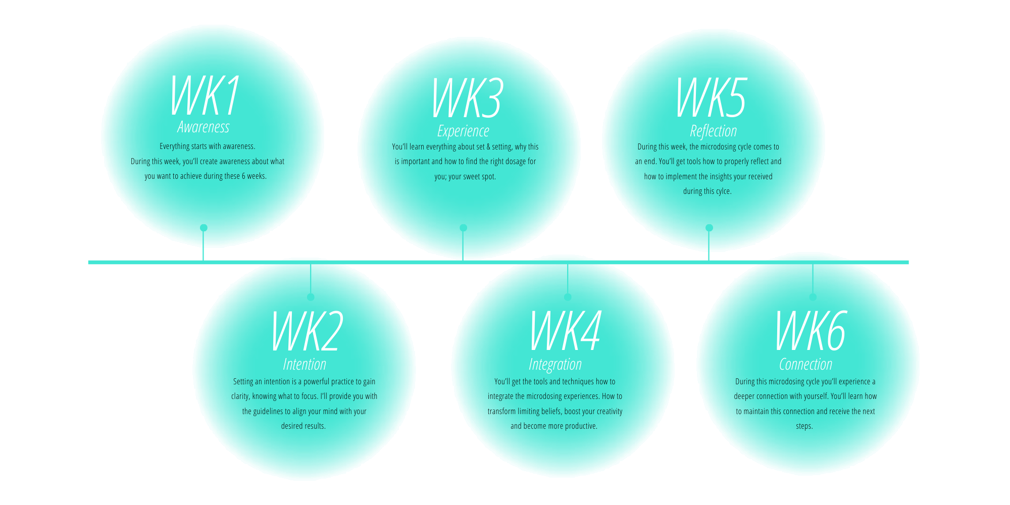 Microdosing is taking a tiny bit of a psychedelic substance, around 5-10% of a regular dose,. You do this on a regular basis with the intention toimprove the quality of your life. Because you take such a small dose, you don’t experience a trippy effect.Instead, the goal is to experience subtle, often imperceptible effects that canhave potential benefits for mental well-being and creativity. If you want to have the best results when microdosing, it’s best if you take itover an extended period of time following a protocol and that you have theright guidance during this period.The exact effects and results of microdosing depends on you as a person, thesubstance, the dosage and many other personal factors such as intention,expectations and mindset. And that’s why we’re going to cover all these aspects during this 6 weeksjourney.